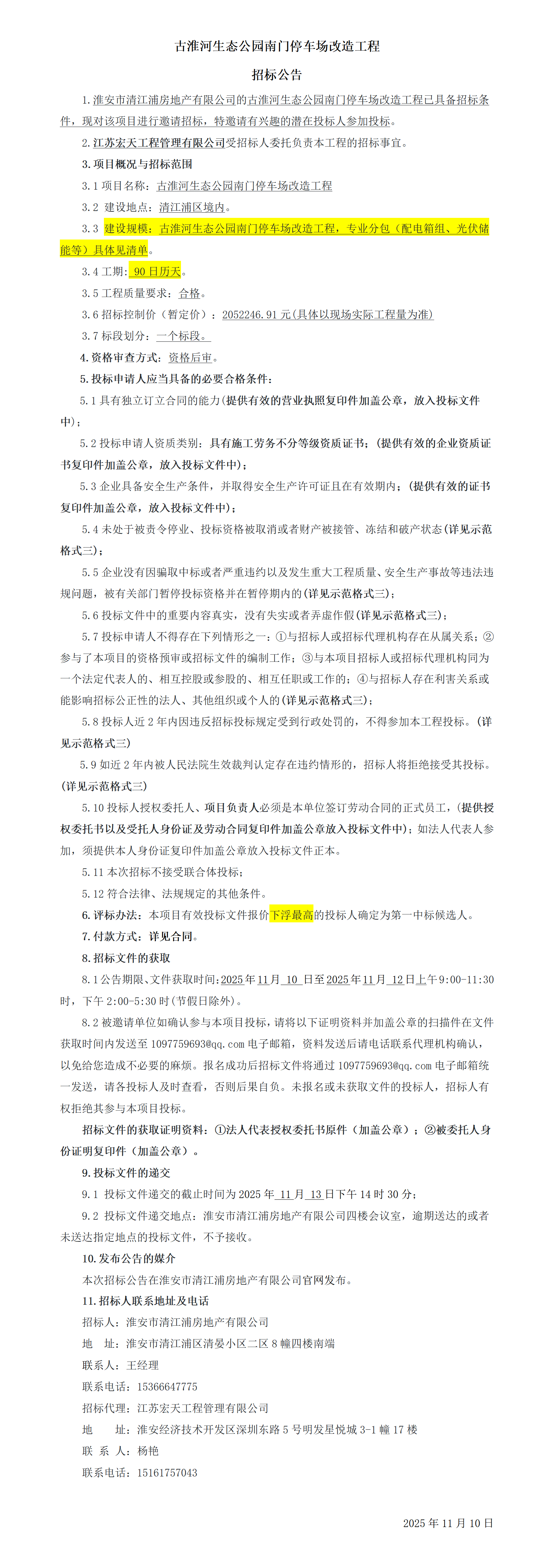 古淮河生态公园南门停车场改造工程专业分包招标公告