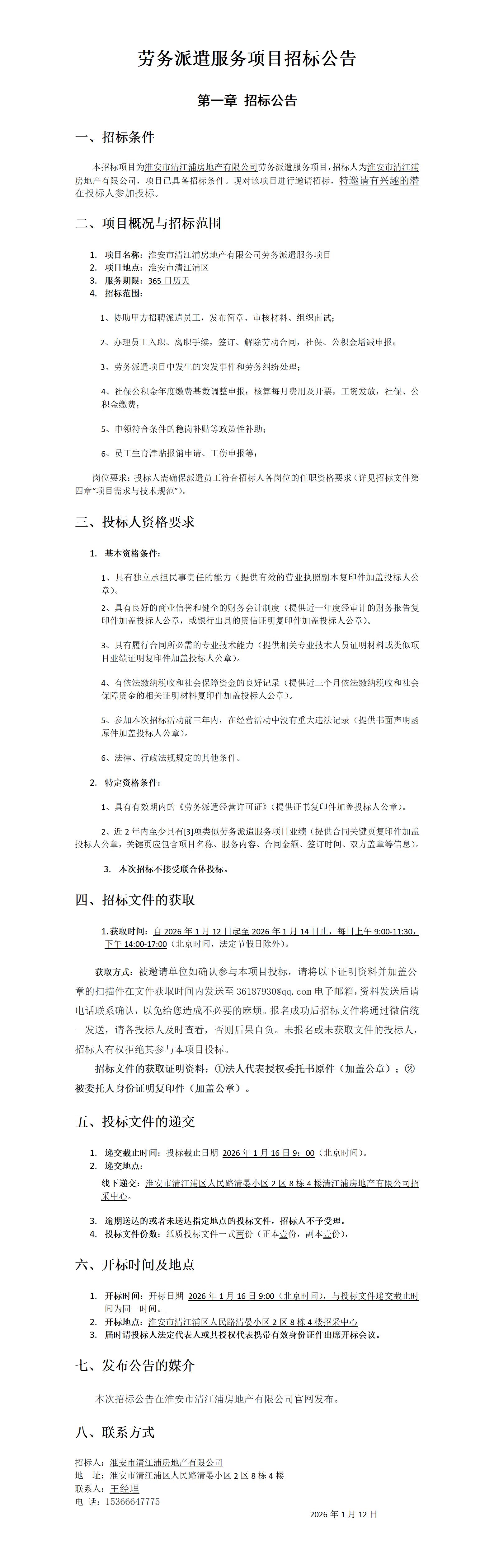 劳务派遣服务项目招标公告
